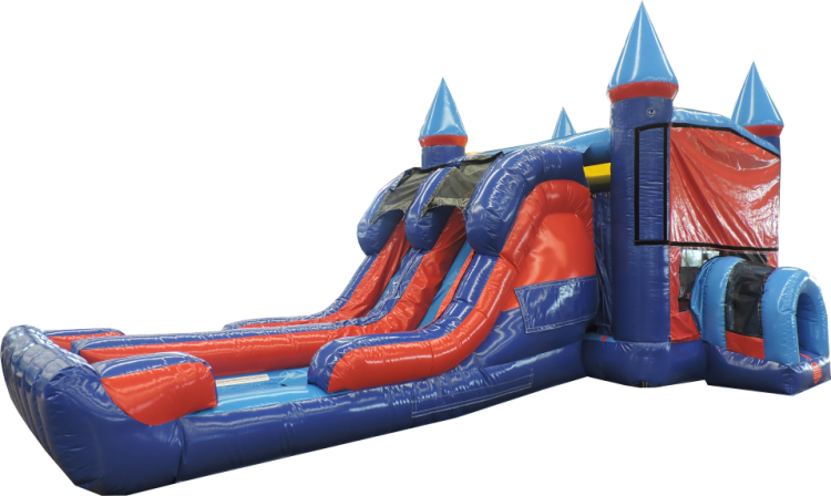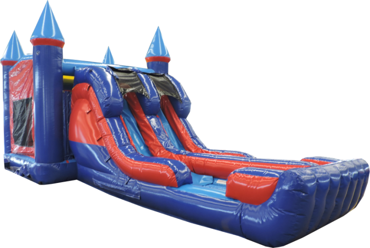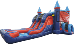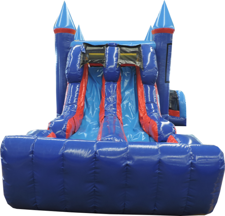Bring big‑league fun to any event with the Elite Castle Combo — a striking blue‑and‑red inflatable that blends a roomy bounce house with a double‑lane water slide for nonstop action. The castle entry and towered corners create a festive focal point while mesh windows keep the bouncing area ventilated and visible for easy supervision. Inside, the cushioned jumping floor and reinforced walls offer a safe space for kids to leap and play, and the attached twin slide lanes lead into a soft, inflatable splash landing that adds excitement without sacrificing safety. Built with durable materials and secure anchoring points for steady performance, this combo is designed for straightforward setup and steady use during parties, school events, backyard celebrations, or community gatherings. With space for multiple kids to play at once and eye‑catching colors that pop in photos, the Elite Castle Combo turns an ordinary day into a memorable, energetic celebration.